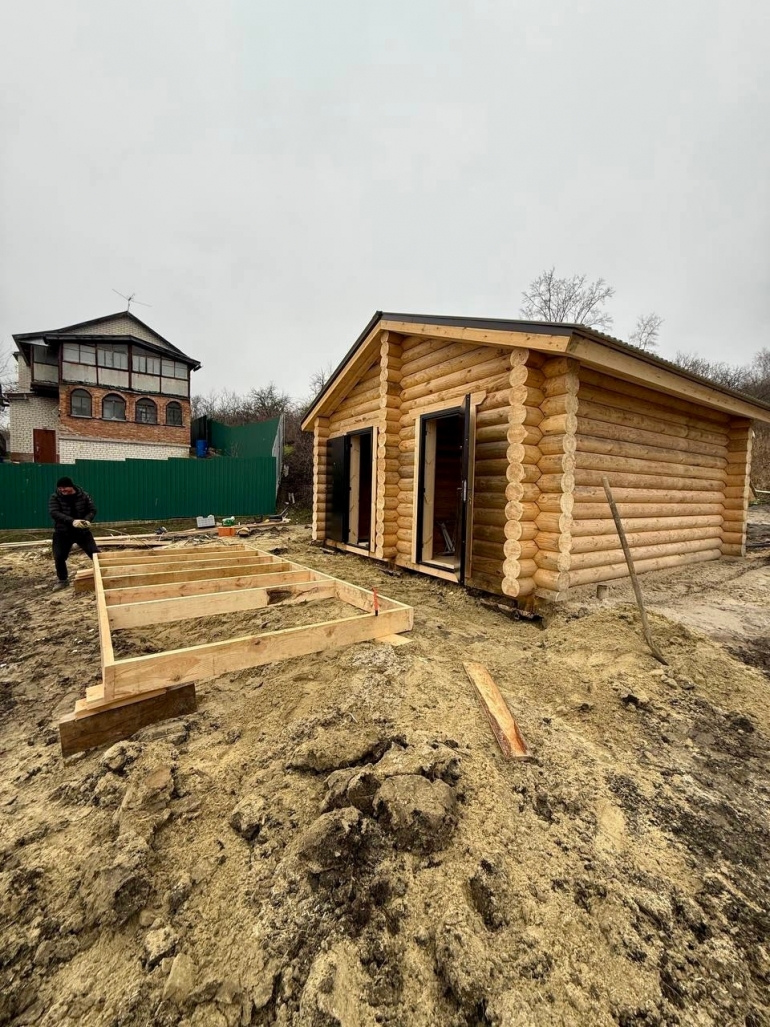 Работы идут по плану. На сегодняшний день собран сруб, установлены чаши и двери, завершена сборка крыши. Сейчас ведутся работы по обустройству входной зоны.