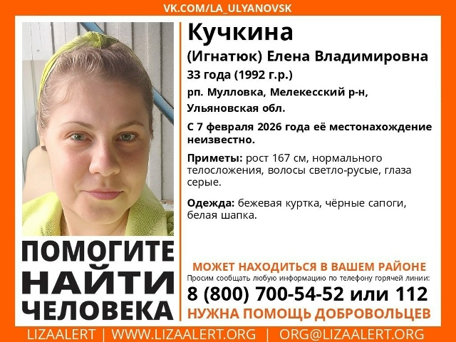 В последний раз родственники видели ее в субботу, 7 февраля. Приметы: рост 167 см, нормального телосложения, волосы светло-русые, глаза серые. В день исчезновения женщина была одета в бежевую куртку, чёрные сапоги и белую шапку.
