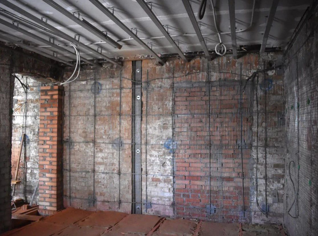 Завершается усиление внутренних стен комнат и коридоров, зашивка потолков помещений с подсистемой, монтаж внутренних электрических и слаботочных сетей, вентиляционного оборудования, восстановление полов с заменой лаг.