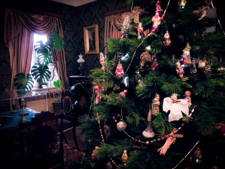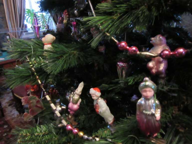 На ёлке, установленной в гостиной музея, представлены игрушки 30-х — 80-х годов 20 века, выполненные из картона, стекла, папье-маше. Каждая обладает своей историей.