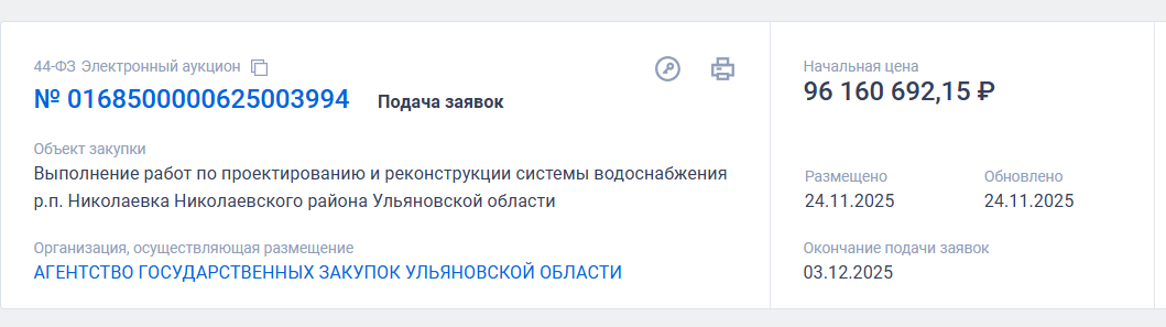 На портале ЕИС «Закупки» началась подача заявок на проектирование и реконструкцию системы водоснабжения рабочем поселке Николаевка Николаевского района. Подать заявку на участие в конкурсе можно до 3 декабря.