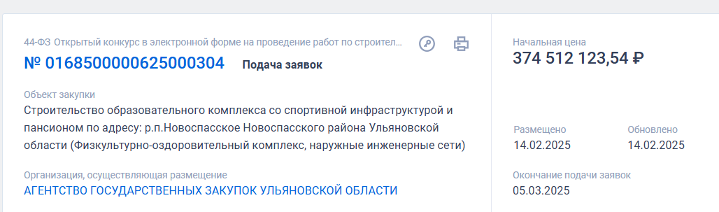 На сайте закупок появилась заявка на поиск подрядчика на строительство образовательного комплекса со спортивной инфраструктурой и пансионом в рабочем поселке Новоспасское. Начальная цена — 374 512 123.