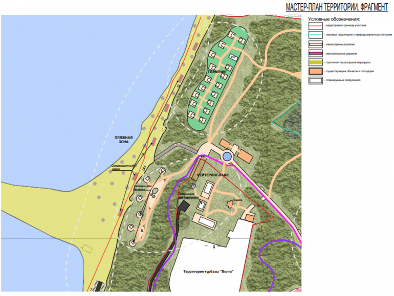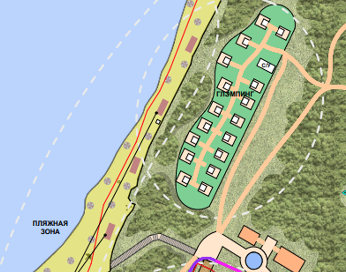 В предварительном варианте ООО "Симбирскпроект" разграничены зоны глэмпинга и пляжного отдыха. Будет организована просторная территория для общепита, установят беседки под аренду.