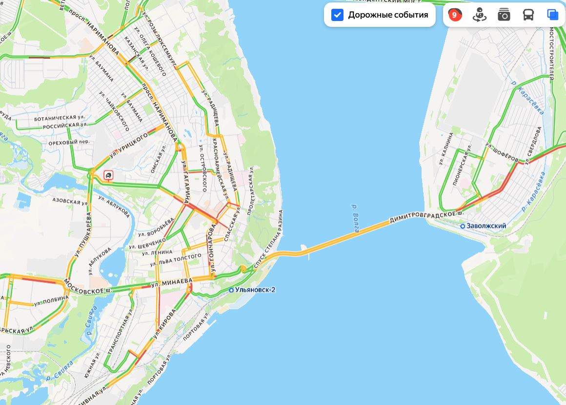Движение особенно затрудненно в центре Ульяновска. Насыщенно красным отмечены улицы Гончарова и Карла Маркса. Самые сильные пробки скопились на улицах Урицкого, 12-Сентября, Минаева, Московском шоссе, Камышинской, Рябикова, Инзенской. На улице Автозаводской пробка образовалась, вероятно, из-за ДТП. На Стасова тоже большая пробка.
