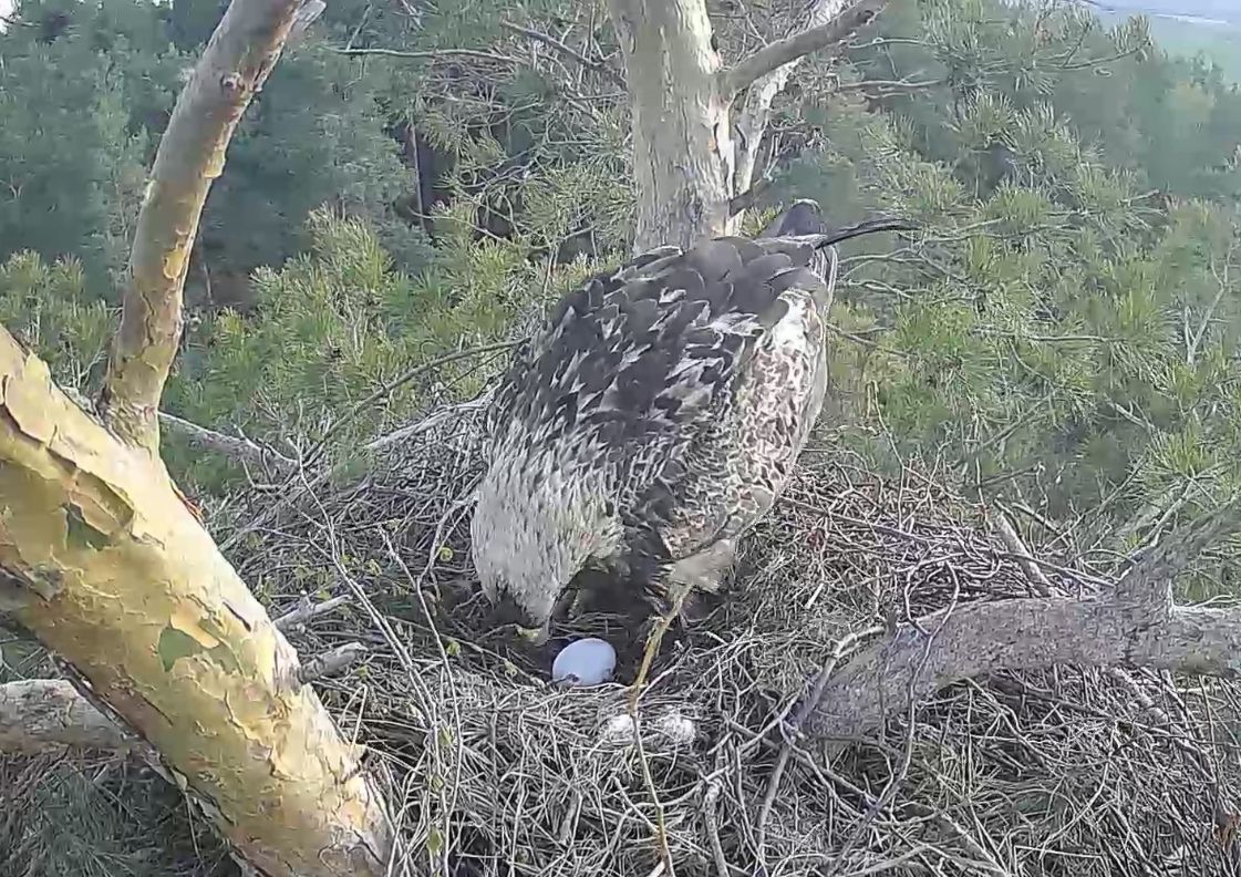 Однако он в ожидании своей подруги Арбушки первое время не проявлял особой активности на гнезде. К сожалению, Арбушка так и не прилетела, вероятно, с ней что-то произошло на зимовке или миграции. Спустя неделю, 24 марта, на гнезде появилась другая самка. А вчера она снесла яйцо.