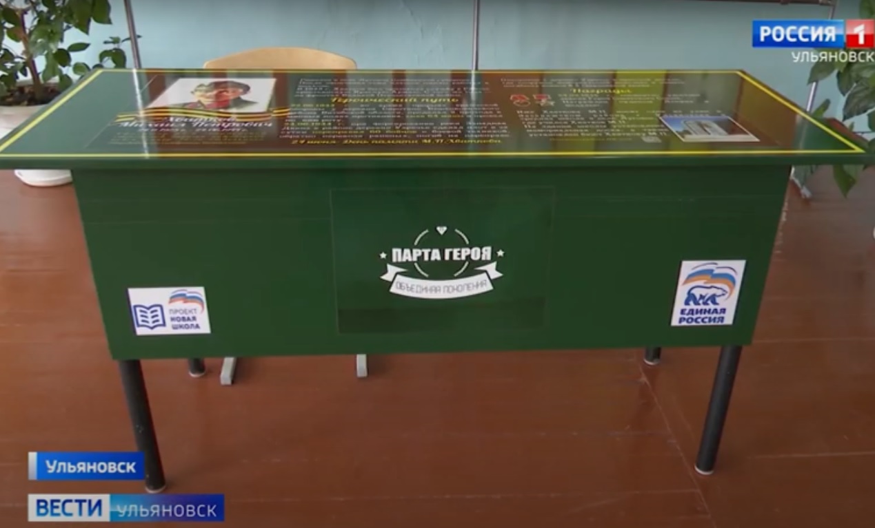 На крышке стола изложена краткая история подвига героя СССР. По куар-коду можно попасть на страницу с полной информацией о Хваткове. Сидеть за партой могут либо отличники, либо активисты школы.