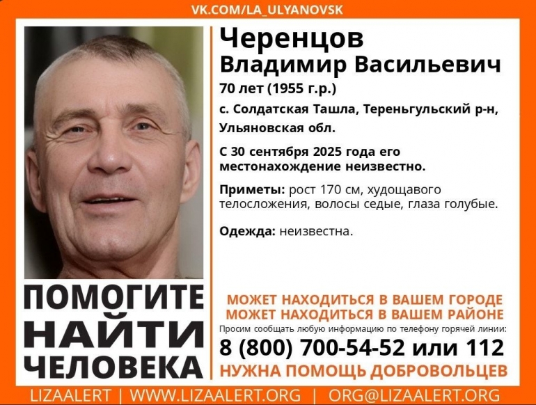 В Тереньгульском районе ульяновской области пропал 70-летний житель села Солдатская Ташла. Его местонахождение неизвестно с 30 сентября.