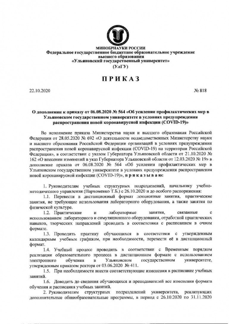 Ректор Ульяновского госуниверситета Борис Костишко подписал Приказ, согласно которому с понедельника, 26 октября, вуз переходит на дистанционное обучение. Это связано с усилениями мер в условии предупреждения распространения COVID-19. При этом, практические и лабораторные занятия, а также творческие направления продолжат проводить в очном формате. Документ опубликован на официальном сайте УлГУ.