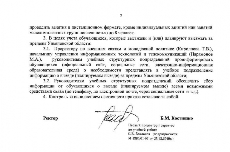 Так, с 26 октября и до особого распоряжения реализация в вузе основных образовательных программ всех уровней осуществляется в дистанционной форме. Дополнительные образовательные программы до 31 ноября будут проходить также путем дистанционного обучения, кроме индивидуальных занятий и занятий в малокомплектных группах до восьми человек. При этом, руководство вуза будет вести мониторинг студентов, планирующих выезды за пределы Ульяновской области. Меры прописаны в приказе ректора и продиктованы приказом Министерства науки и высшего образования РФ об организации деятельности вузов в условиях предупреждения распространения новой коронавирусной инфекции.