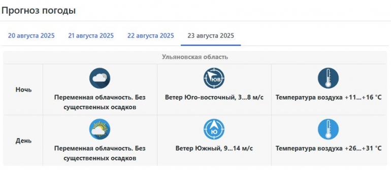 Что же касается завтрашнего дня, то в ночь на четверг, 21 августа, ожидается переменная облачность. Дождей синоптики не прогнозируют. Ветер будет дуть юго-западный со скоростью 3 – 8 метров в секунду. Температура воздуха составит +8...+13 °C.