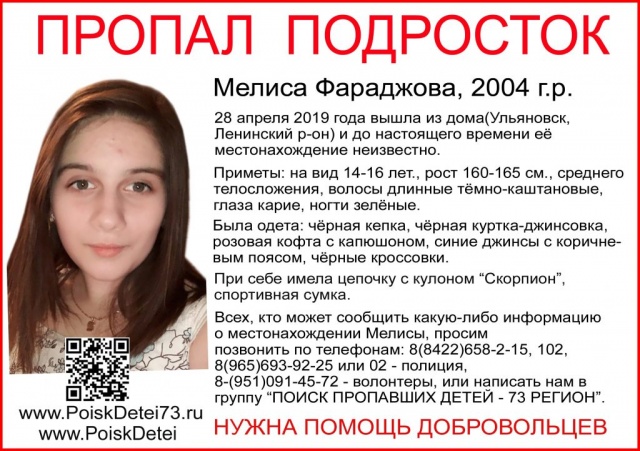 В ульяновской группе поиска пропавших людей сообщили, что 28 апреля вышла из дома в Ленинском районе и до настоящего времени не вернулась 14-летняя Мелиса Фараджова (2004 г.р.). Требуется помощь волонтеров.