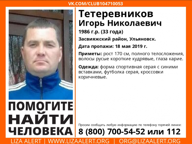 В Засвияжском районе Ульяновска 18 мая пропал мужчина – 33-летний Игорь Тетеревников, сообщается в группе по поиску людей «ВК».