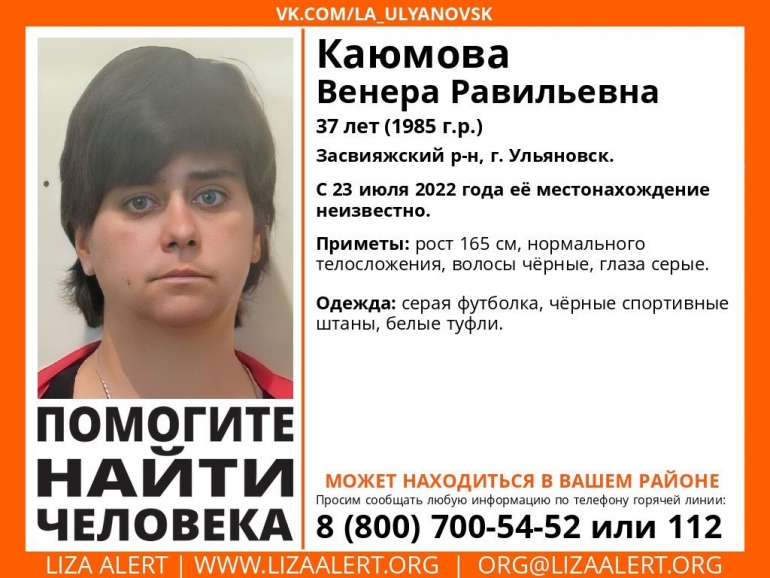 Венера Каюмова пропала 23 июля. Последний раз ее видели в Засвияжском районе Ульяновска, сообщают представители поисково-спасательного отряда «Лиза Алерт».