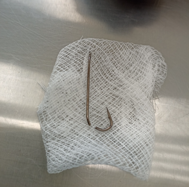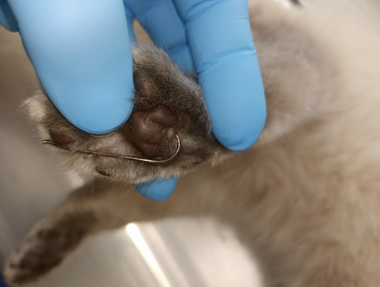 Как выяснилось, котик решил поиграть с рыболовными снастями и попался на крючок. Владельцы доставили его в ветеринарную клинику, где специалисты после осмотра с применением сочетанной анестезии извлекли крючок из верхней губы и подушечки левой грудной конечности.