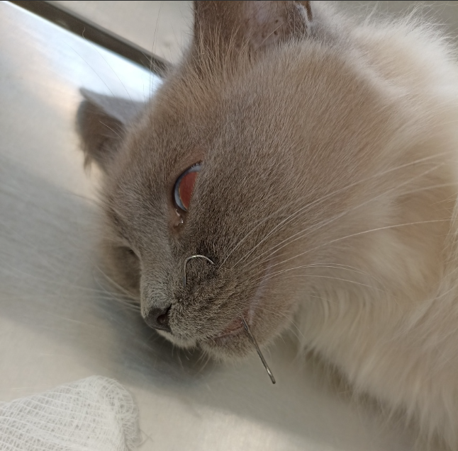 В ветклинику Центра обратились владельцы кота с жалобами на хромоту и болевой синдром в области головы. Питомец не давал себя осмотреть, но хозяева увидели рыболовный крючок в лапе и верхней губе питомца.