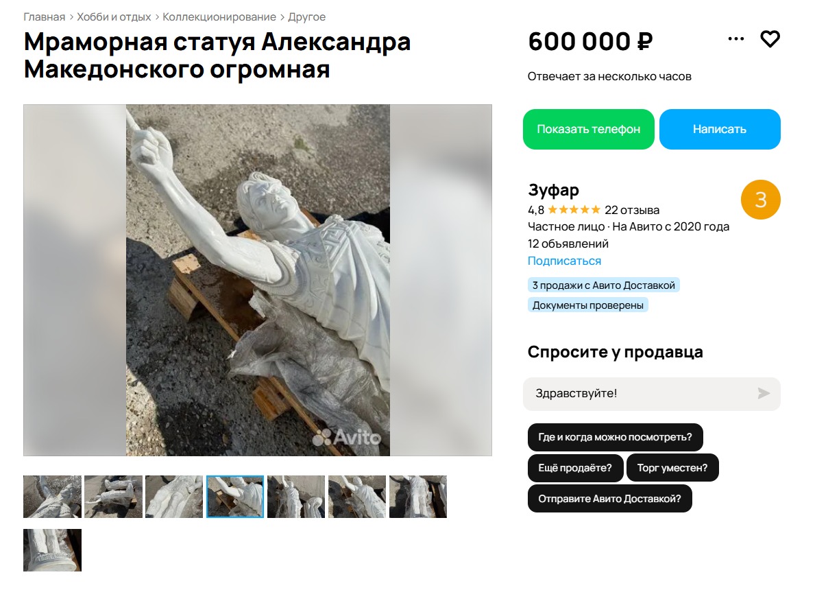 На «Авито» разместили объявление о продаже двух мраморных статуй Александра Македонского — царь Древней Македонии из династии Аргеадов и выдающийся полководец оценен продавцом в 600 тысяч рублей.