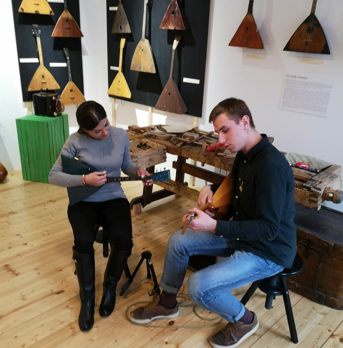 В музее балалайки ведущая программы Юлия Розенберг сыграла на балалайке.