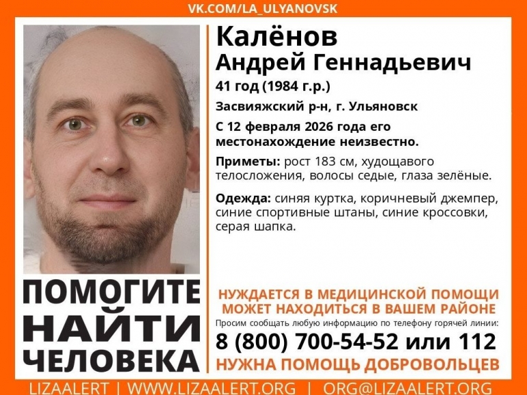 Поисковый отряд «Лиза Алерт» сообщает, что вчера, 12 февраля, в Засвияжском районе Ульяновска пропал 41-летний местный житель Андрей Калёнов.