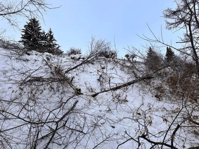 В городской администрации заверили, что ценные породы деревьев, произрастающие в парке ниже по склону, в ходе работ не затрагиваются. Для работы спасатели используют альпинистское оборудование и бензопилы, порубочные остатки поднимают с помощью автокрана и увозят на полигон ТКО.