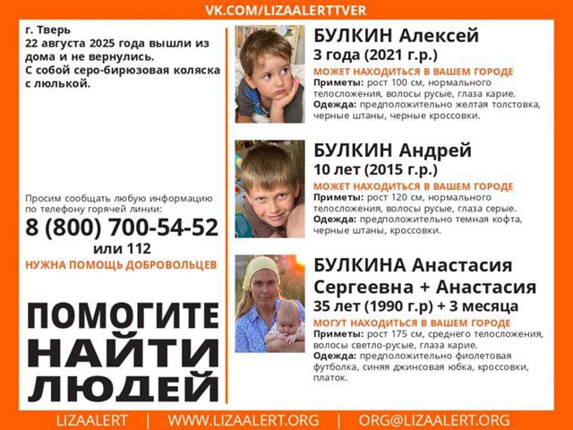 Пропавшие 35-летняя Анастасия Булкина и ее дети – 3-месячная дочь Настя, 3-летний Алексей и 10-летний Андрей пропали в Твери. 22 августа они вышли из дома и не вернулись.