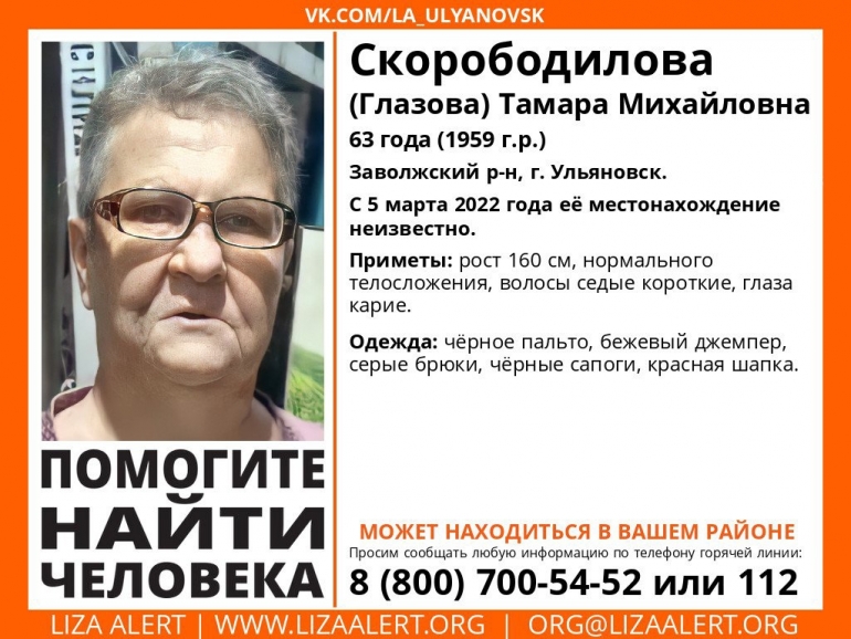С пятого марта в Ульяновске ищут 63-летнюю Тамару Скорободилову (Глазову). Последний раз ее видели в Заволжском районе, сообщают волонтеры поискового отряда «Лиза Алерт».