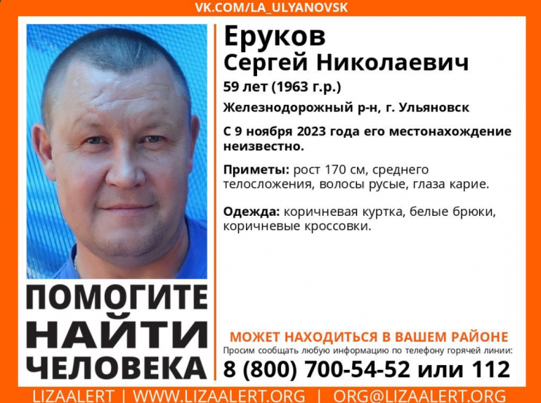 В Железнодорожном районе Ульяновска 9 ноября пропал 59-летний местный житель Сергей Еруков. Найти его не могут до сих пор.