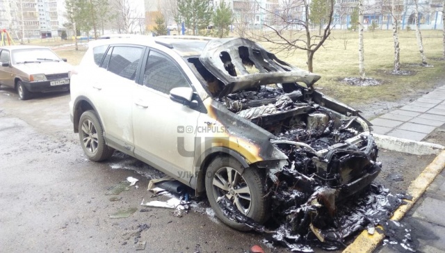 Сегодня ночью, 23 апреля, в Ульяновске во дворе дома №49 на улице Репина сгорела Toyota RAV4. Как сообщают очевидцы, из-за стоящих вдоль домов машин пожарным не удалось проехать к горящей иномарке.
