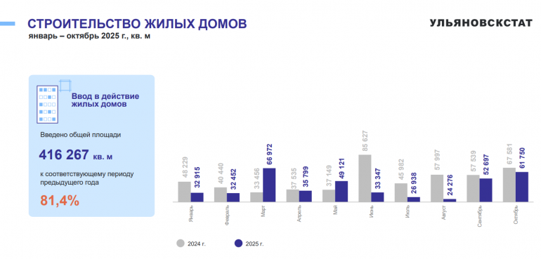 С января по октябрь текущего года в эксплуатацию ввели 416 267 квадратных метров жилья. За год этот показатель снизился на 18,6%.