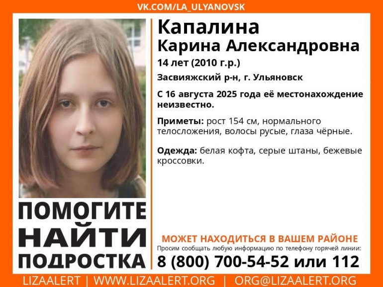В Ульяновске разыскивают 14-летнюю Карину Капалину, которая пропала 16 августа в Засвияжском районе.