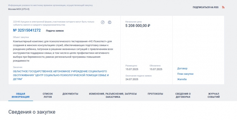 На сайте ЕИС Закупки появилась информация о проведении электронных торгов на приобретение компьютерного комплекса для психологического тестирования за 5 млн 208 тыс рублей — он необходим для создания в женских консультациях служб, обеспечивающих подготовку семьи к рождению ребенка и патронаж в решении жизненных ситуаций.