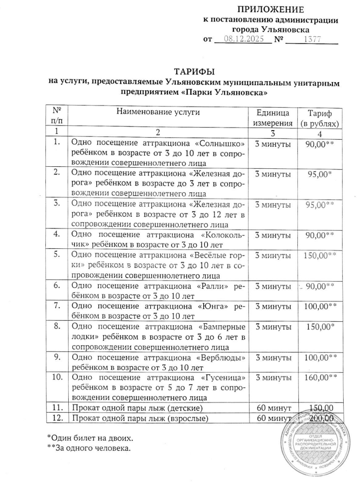 Городская администрация опубликовала стоимость катания на аттракционах в городских парках на 2026 год, относящихся к УМУП «Парки Ульяновска» — «Победы», «Семья», «Молодежный», «40 лет ВЛКСМ», «Прибрежный», «Владимирский сад» и «Винновская роща».
