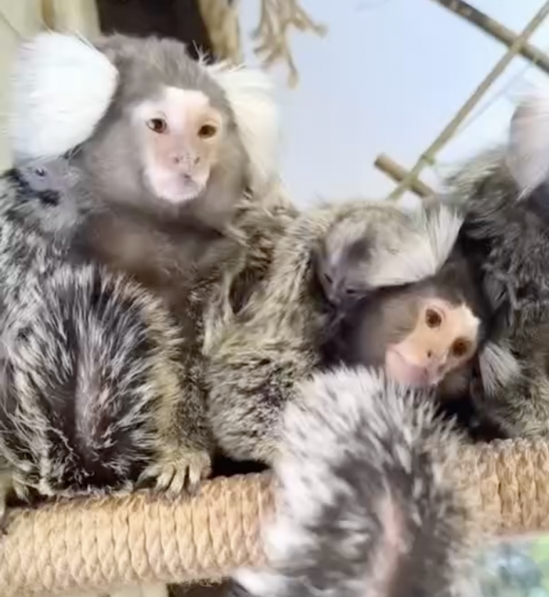 А недавно пополнение произошло в семье обыкновенных игрунок. На свет появились два крошечных малыша. Первые 2 месяца почти все время малыши находятся на спинке у самца, где он их греет и защищает, самка же забирает их только на время кормления.