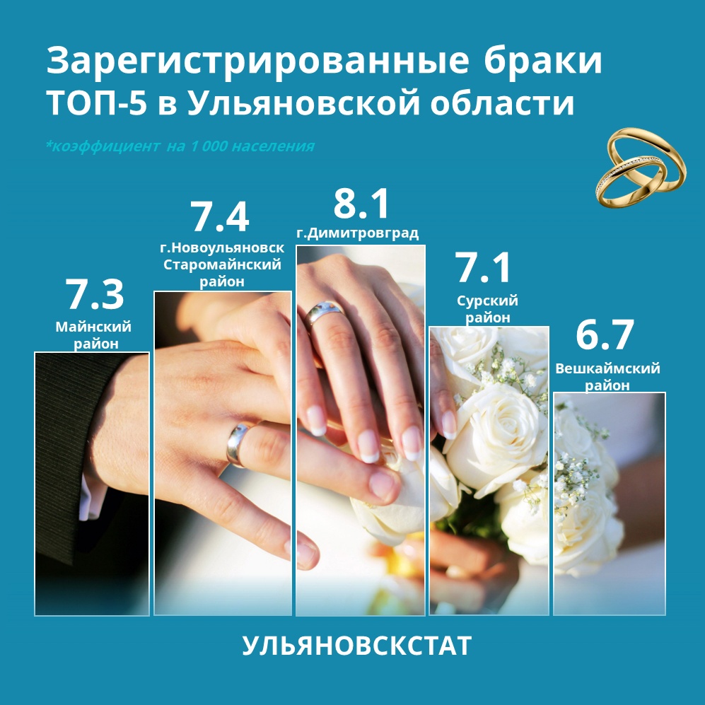 В лидеры вышел город Димитровград. Его коэффициент зарегистрированных супружеских пар составил 8.1. Второе место поделили между собой с коэффициентом в 7.4 город Новоульяновск и Старомайнский район. Замыкает тройку лидеров Майнский район с показателем 7.3. Практически вровень с ним оказался Сурский район – 7.1. На пятом месте оказался Вешкаймский район (6.7).