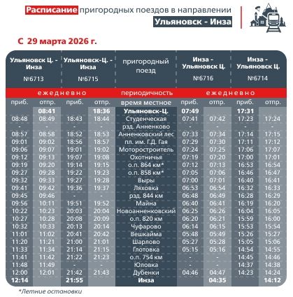- Ульяновск — Инза (поезда №6713, №6715, №6716, №6714). Изменения в расписании предусмотрены на всех остановочных пунктах, включая Студенческую, Майну, Вешкайму и другие;
