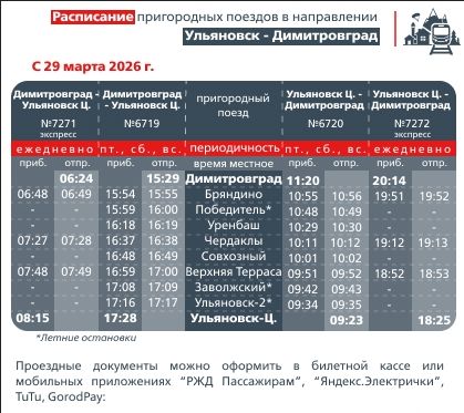 - Ульяновск — Димитровград (поезда №7271, №6719, №7272, №6720). Новое расписание действует для ежедневных рейсов, а также для экспрессов по пятницам, субботам и воскресеньям;