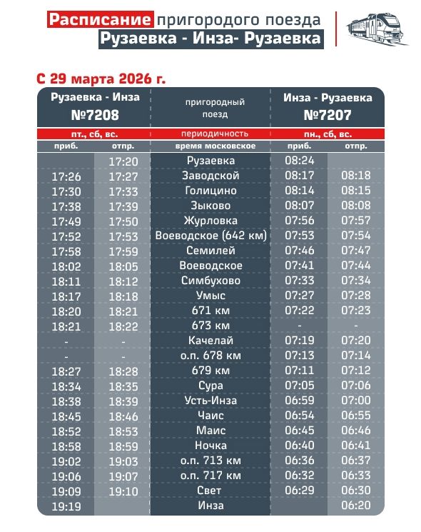 - Рузаевка — Инза — Рузаевка (поезда №7208 и №7207). Изменения вводятся с учетом периодичности: №7208 отправляется по пятницам, субботам и воскресеньям, №7207 — по понедельникам, субботам и воскресеньям;