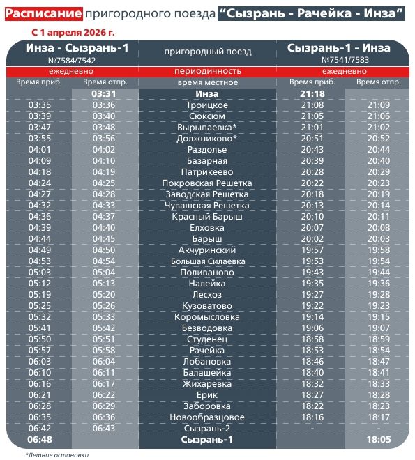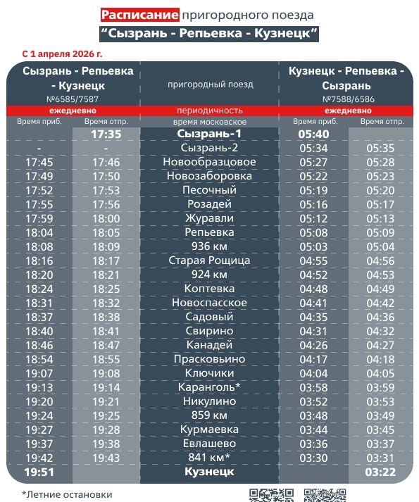 - Сызрань — Репьевка — Кузнецк (поезда №6585/7587 и №7588/6586). С 1 апреля обновленное расписание будет действовать ежедневно;