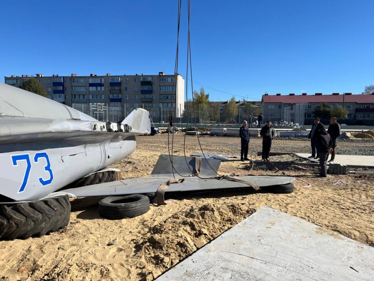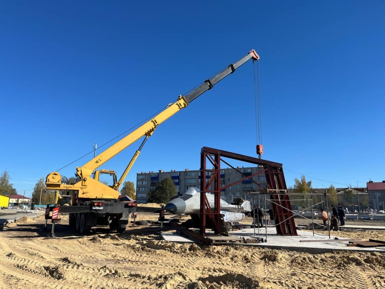 На данный момент на объекте уложено резиновое покрытие на спортивной площадке, установлено ограждение, залит фундамент и сделан постамент под самолет. Ведется укладка тротуарной плитки, монтаж светильников, устройство основания под дорожки и спортивные тренажеры, проводится озеленение.