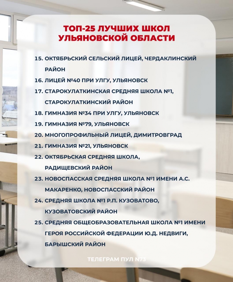 В топ-25 вошли школы из Ульяновска, Димитровграда, Чердаклинского, Старокулаткинского, Новоспасского, Радищевского, Барышского и Кузоватовского районов.