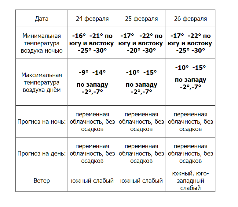 Завтра, 24 февраля, синоптики прогнозируют переменную облачность, без осадков. Ветер будет дуть южный, слабый. Ночью температура воздуха составит -16,-21 гр., по югу и востоку до -25,-30 гр., днем прогреется до -9, -14.