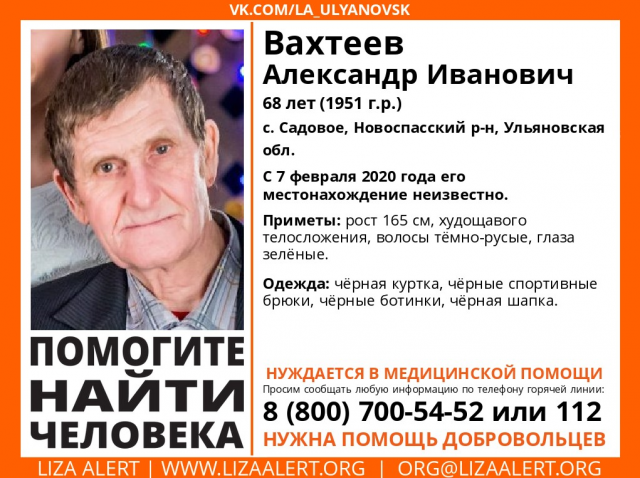 В пятницу, 7 февраля, в селе Садовое Новоспасского района пропал 68-летний местный житель Александр Вахтеев. Об этом сообщается в группе по поиску людей.