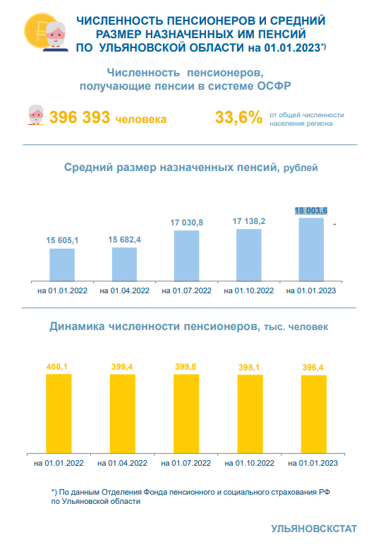 Средний размер начисленной пенсии в начале прошлого года составлял 15 605,1 рубля, в январе этого года средняя пенсия в Ульяновской области - 18 003,6 рубля. За год выплаты пенсионерам повышали 4 раза: в апреле, июле, октябре и январе.