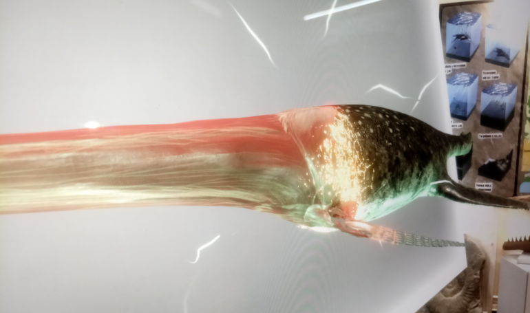 С помощью специального приложения на планшете, установленного на подвижной стойке, производится наведение на скелет эласмозавра, и посетители наблюдают, как древняя морская рептилия оживает.