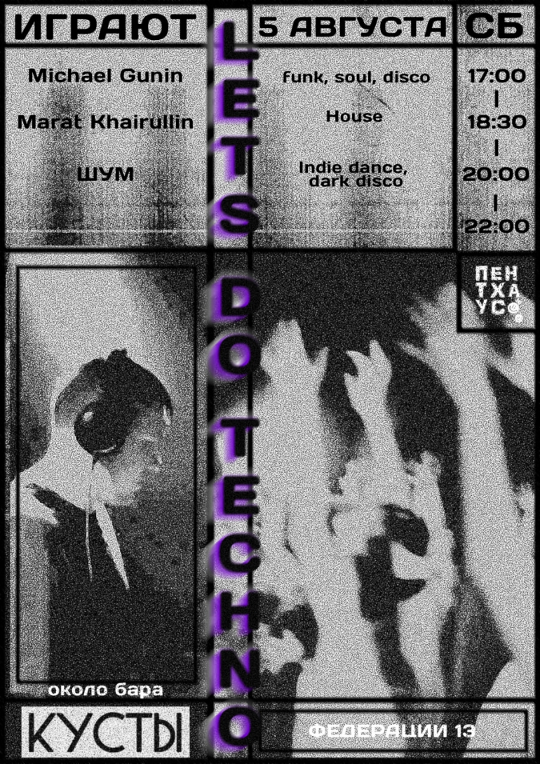 В 20:00 публику начнет развлекать основатель студии-школы диджеинга — Studio 25 Шум. В этот вечер в плей-листе диджея - Dark disco, Indie dance и другая музыка.