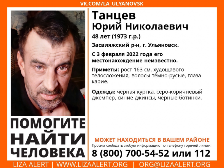 Волонтеры из поисково-спасательного отряда «Лиза Алерт» сообщают, что в Засвияжском районе Ульяновска пропал 48-летний местный житель Юрий Танцев.