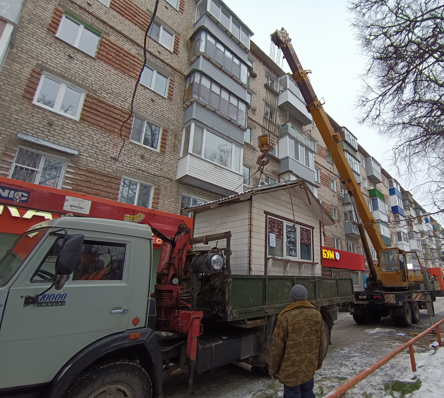 При помощи автокрана и грузовика киоск переместили на специализированную площадку, забрать оттуда его собственник может, оплатив расходы муниципалитета на демонтаж, перевозку и хранение.