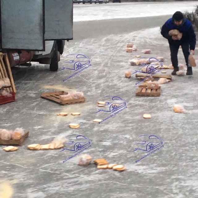 Очевидцы сообщают, что хлеб вывалился из грузовой ГАЗели, которая его перевозила. Видимо, водитель плохо закрыл фургон, и возле ДК «УАЗ» буханки выпали на дорогу.