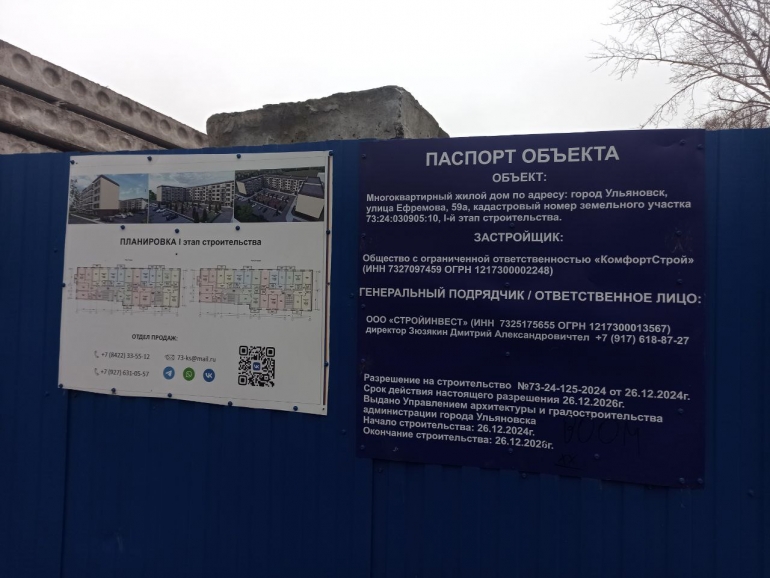 Разрешение на строительство «КомфортСтрой» получил под Новый год в 2024-м, работы должны завершить до 26 декабря 2026 года. Сейчас выполняется первый этап строительства. Согласно обнародованной визуализации проекта, на уд. Ефремова, 59а вскоре возведут пятиэтажный многоквартирный дом П-образной формы с детской площадкой и парковкой во дворе. Генподрядчиком выступает ООО «Стройинвест».