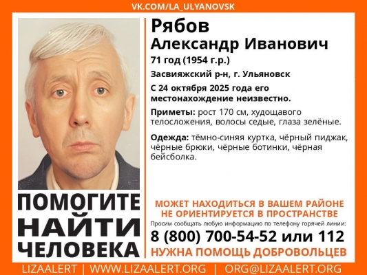По данным поисково-спасателбного отряда «ЛизаАлерт», Александр Рябов пропал в Засвияжском районе.