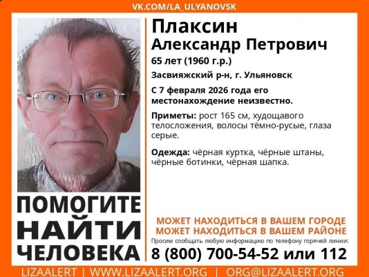 В Засвияжском районе Ульяновска разыскивают 65-летнего местного жителя Александра Плаксина, который пропал без вести 7 февраля.